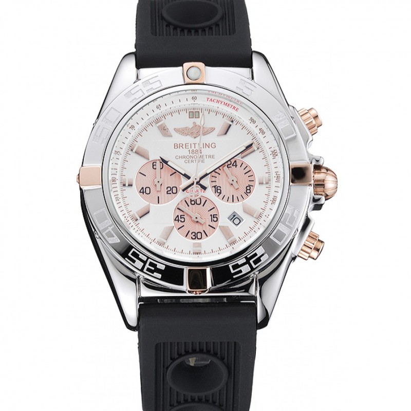 Aktion!Breitling Chronomat Rose-Gold-Highlight-gewelltes schwarzes Kautschukband weißes Zifferblatt