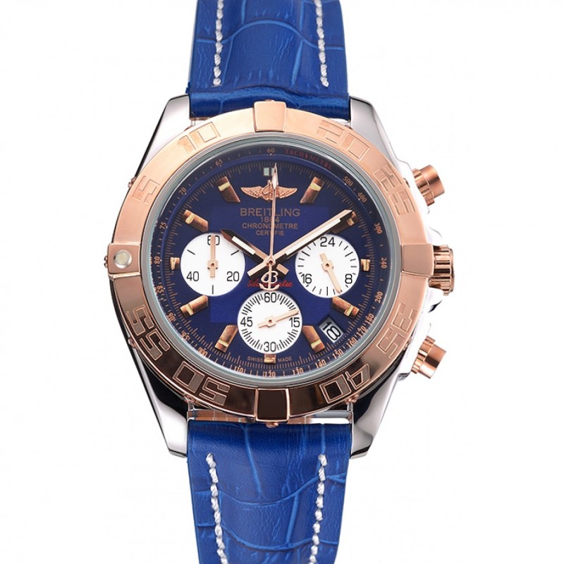 Aktion!Breitling Chronomat blaues Zifferblatt Edelstahl Gehäuse-Gold-Lünette Blau Lederband