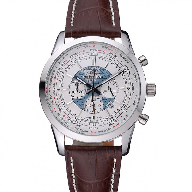 Aktion!Breitling Transocean Chronograph Unitime weißes Zifferblatt Edelstahl Gehäuse-Brown-Leder-Armband 622244