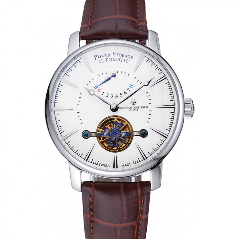 Aktion!Vacheron Constantin Tourbillon Power Reserve weißes Zifferblatt Silber Fall Brown-Leder-Armband 1454275
