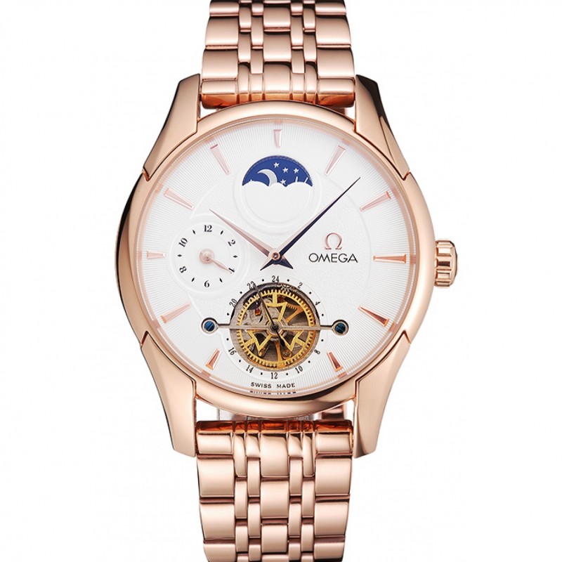 Aktion!Omega De Ville Tourbillon Mondphase weißes Zifferblatt Rose Gold Gehäuse und Armband