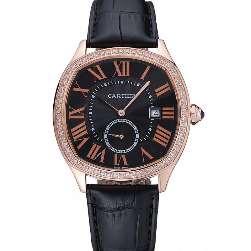 Aktion!Cartier Antrieb De Cartier schwarzes Zifferblatt Gold-Diamant-Kasten-Schwarz-Leder-Armband 1454217