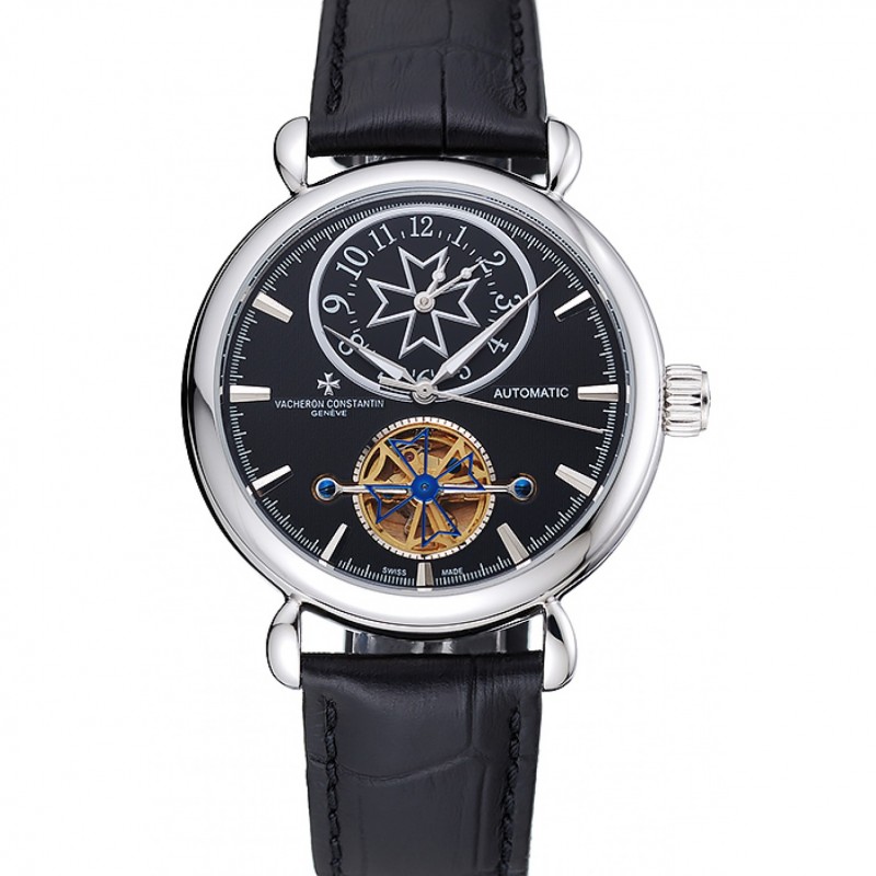 Aktion!Vacheron Constantin Traditionnelle Tourbillon mit schwarzem Zifferblatt Silber-Fall-Schwarz-Leder-Armband 1454063